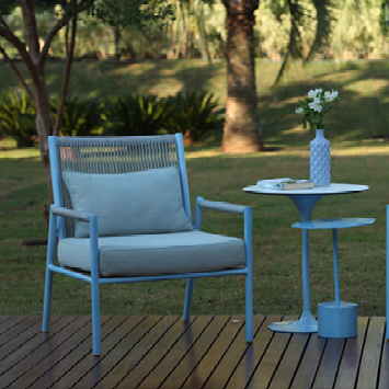 Made with an aluminum frame, handwoven nautical rope backrest, and outdoor fabric cushions on the seat and back.