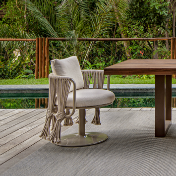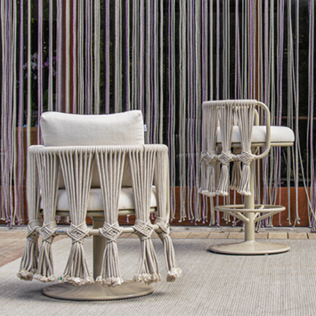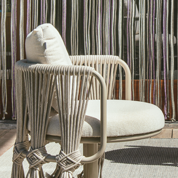 The powder-coated aluminum frame provides lightness and durability, while the backrest in handwoven nautical rope using the macramé technique adds an artisanal and contemporary finish. Ideal for dining areas, balconies, gourmet spaces, and social environments with elegance and flow.