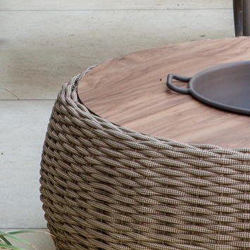 Designed by Luciano Mandelli, the Marina Coffee Table With Fireplace 136cm is a Tidelli classic that combines design and functionality for outdoor living. Its aluminum frame is handwoven with nautical rope or fiber, with top options in stone or HPL.