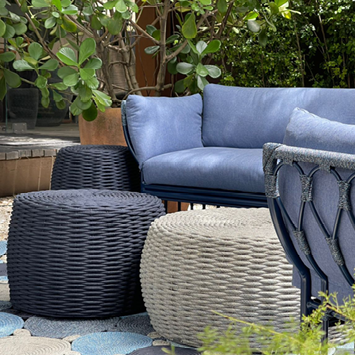 Designed by Luciano Mandelli, the Marina Ottoman brings practicality and sophistication in a timeless design. Its aluminum frame is handwoven with nautical rope or fiber, adding both durability and style.