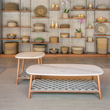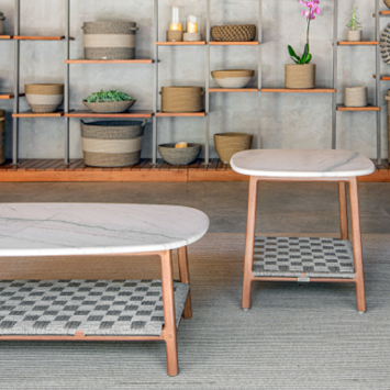 With a striking design, the Padang Coffee Table with granite top and wooden structure received an aluminum support with nautical rope braid, perfect for functional outdoor areas.