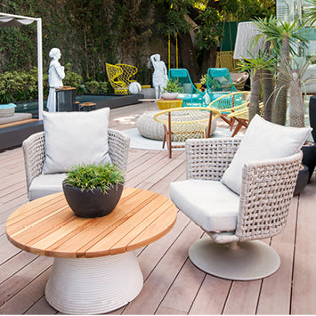 Eucalyptus Wood is used for the structure of selected Tidelli furniture, from armchairs to table tops. A team of 40 carpenters works solely with recycled wood from demolition or reforestation projects. Handmade craftsmanship upcycles raw materials. Wood that is not only sustainable but also unique. Adding personality to these one-of-a-kind products. Wood being a natural material, it may change color or even crack due to humidity levels or sudden changes in temperature. When left outdoors, wood undergoes a natural process of oxidation. To maintain and restore the original appearance of your Madeira wood Tidelli furniture, reapply varnish. We recommend purchasing directly from our resellers according to the tone of your furniture, in order to maintain the original appearance. Ask a Tidelli consultant what is the right product to use. Depending on the location of use and its exposure to the sun, the wood may lose its original appearance between 6 to 24 months.