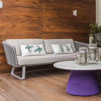 Designed by Luciano Mandelli, the Marina Sofa 190cm embodies the balance between comfort and elegance for outdoor spaces. Its aluminum frame is handwoven with nautical rope or fiber, materials that ensure durability and refined aesthetics. Upholstered cushions in fabric add coziness and versatility.