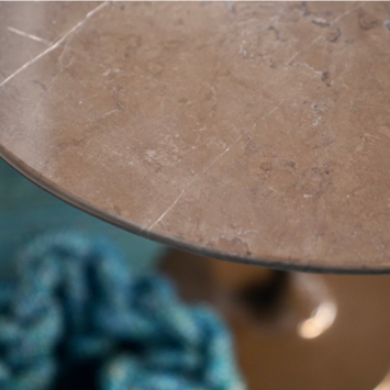 The aluminum base supports a top available in stone, wood, or HPL, allowing for different visual compositions.