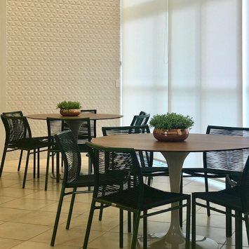 Inspired by the simplicity of modernist design, its circular shape encourages interaction and a fluid atmosphere.