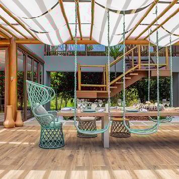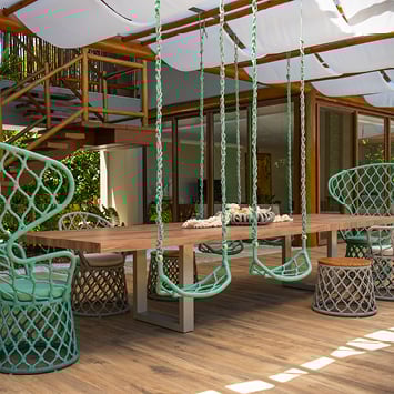 Eucalyptus Wood is used for the structure of selected Tidelli furniture, from armchairs to table tops. A team of 40 carpenters works solely with recycled wood from demolition or reforestation projects. Handmade craftsmanship upcycles raw materials. Wood that is not only sustainable but also unique. Adding personality to these one-of-a-kind products. Wood being a natural material, it may change color or even crack due to humidity levels or sudden changes in temperature. When left outdoors, wood undergoes a natural process of oxidation. To maintain and restore the original appearance of your Madeira wood Tidelli furniture, reapply varnish. We recommend purchasing directly from our resellers according to the tone of your furniture, in order to maintain the original appearance. Ask a Tidelli consultant what is the right product to use. Depending on the location of use and its exposure to the sun, the wood may lose its original appearance between 6 to 24 months.