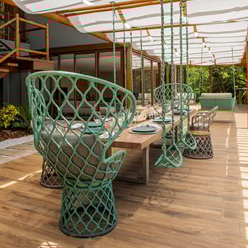 Eucalyptus Wood is used for the structure of selected Tidelli furniture, from armchairs to table tops. A team of 40 carpenters works solely with recycled wood from demolition or reforestation projects. Handmade craftsmanship upcycles raw materials. Wood that is not only sustainable but also unique. Adding personality to these one-of-a-kind products. Wood being a natural material, it may change color or even crack due to humidity levels or sudden changes in temperature. When left outdoors, wood undergoes a natural process of oxidation. To maintain and restore the original appearance of your Madeira wood Tidelli furniture, reapply varnish. We recommend purchasing directly from our resellers according to the tone of your furniture, in order to maintain the original appearance. Ask a Tidelli consultant what is the right product to use. Depending on the location of use and its exposure to the sun, the wood may lose its original appearance between 6 to 24 months.